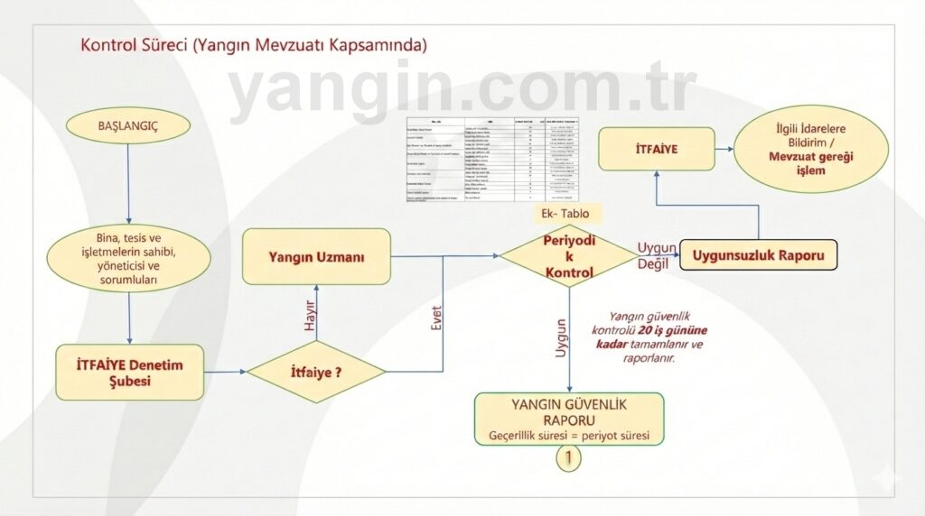 Sürecin en dikkat çekici detaylarından biri ise zaman kısıtlaması. Akış şemasında vurgulandığı üzere, yangın güvenlik kontrolünün 20 iş gününe kadar tamamlanması ve raporlanması gerekiyor. Bu kural, denetimlerin sürüncemede kalmamasını ve olası risklere karşı hızlı aksiyon alınmasını zorunlu kılıyor.